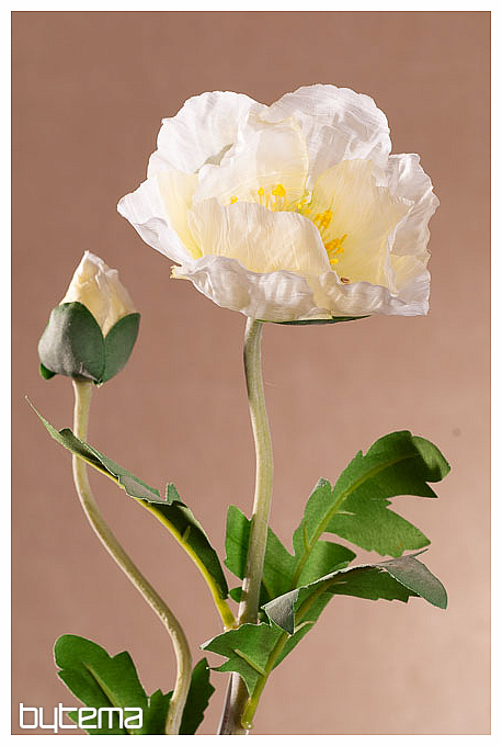 Una amapola con una flor blanca y un capullo. Tiene varias hojas en un tallo de 69 cm de largo. Debido a su procesamiento, la flor se confunde fácilmente con la verdadera que crece en prados y campos.