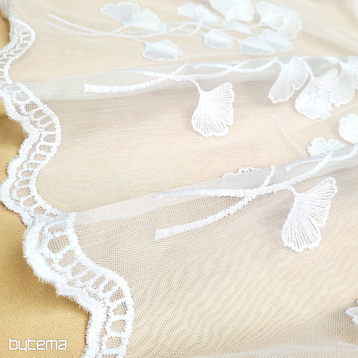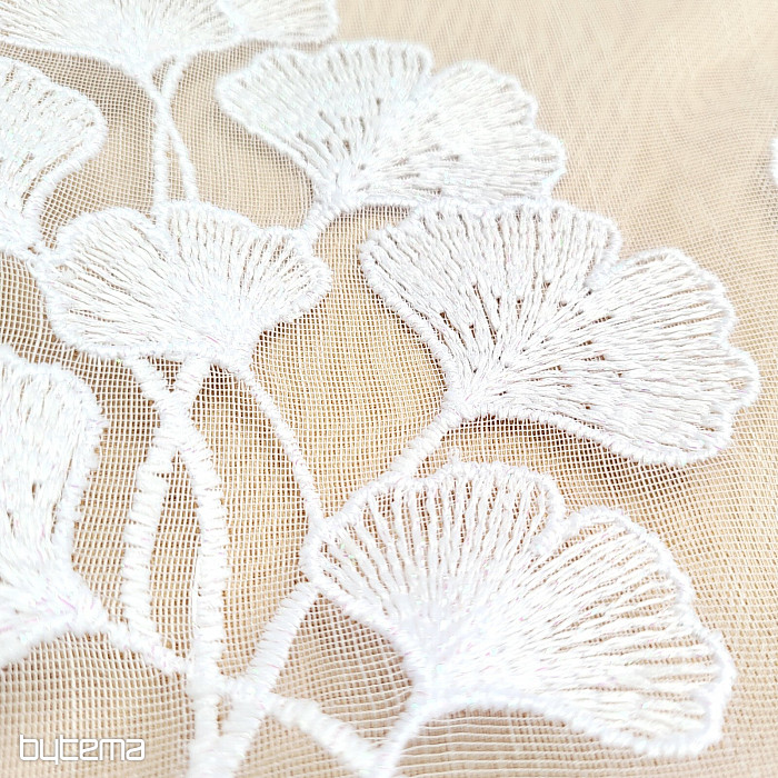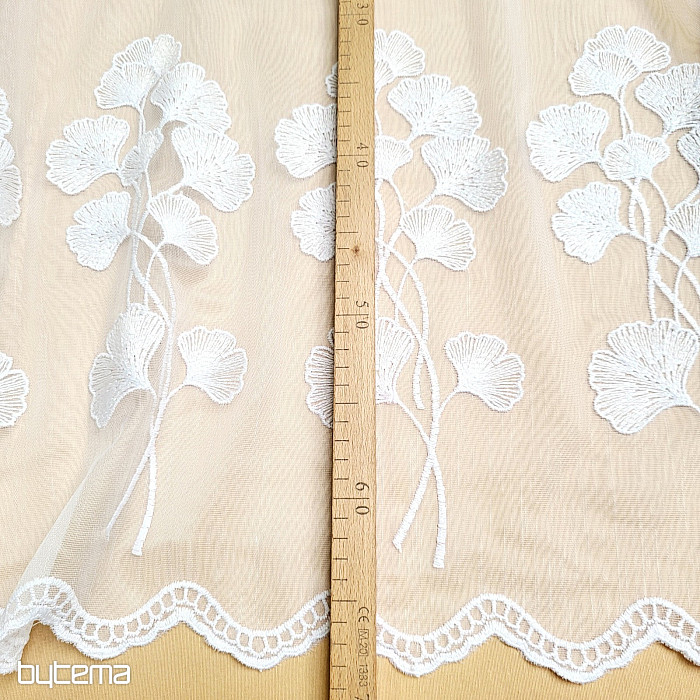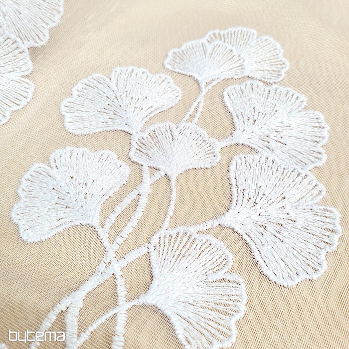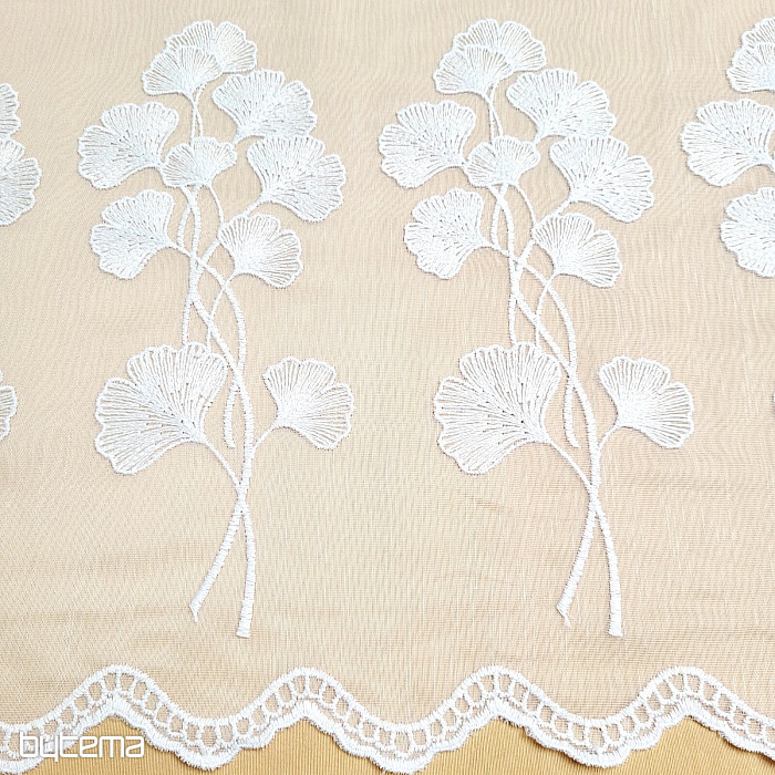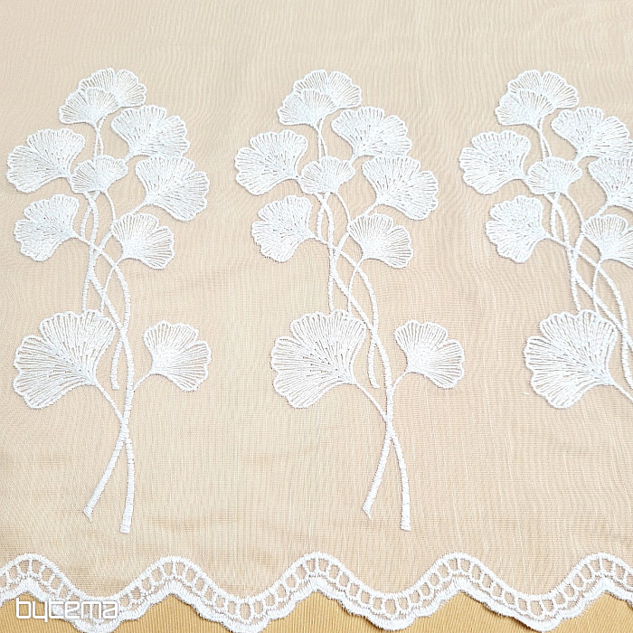 Una moderna cortina bordada, lisa en toda su superficie y rematada con un gran borde de flores de ginkgo biloba.