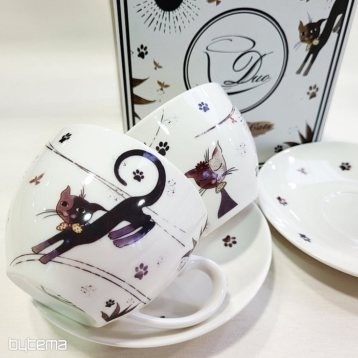 Dos tazas de 280 ml y dos platillos de porcelana. El juego completo se presenta en una caja de cartón impresa.