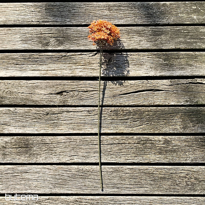 El tallo mide 71 cm de largo y tiene dos flores compuestas por varios ramilletes pequeños de color naranja. La flor grande tiene un diámetro de 16 cm y la pequeña, de 11 cm. El tallo es de color gris verdoso oscuro, lo que le da un aspecto realista.