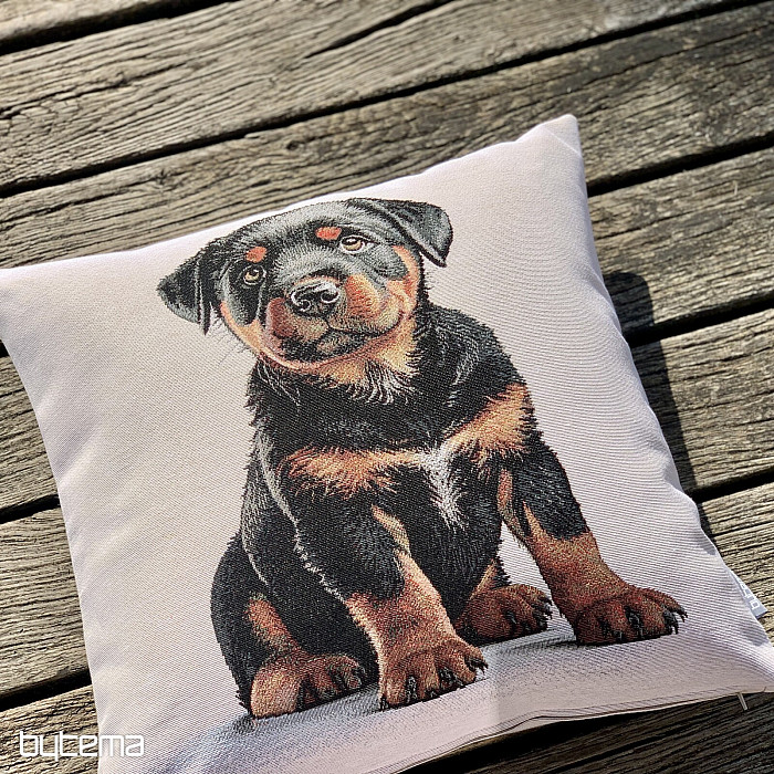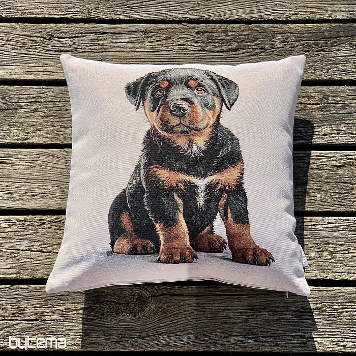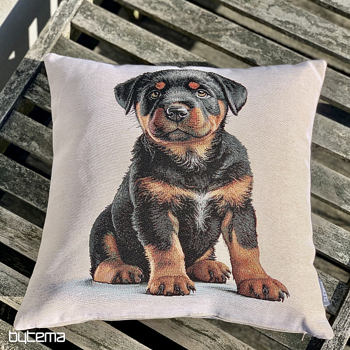 Funda de almohada tapizada con un cachorro de rottweiler. Un regalo precioso para los amantes de esta raza.