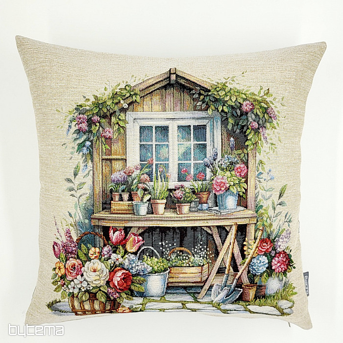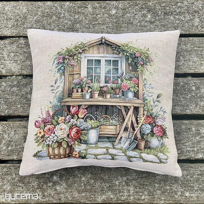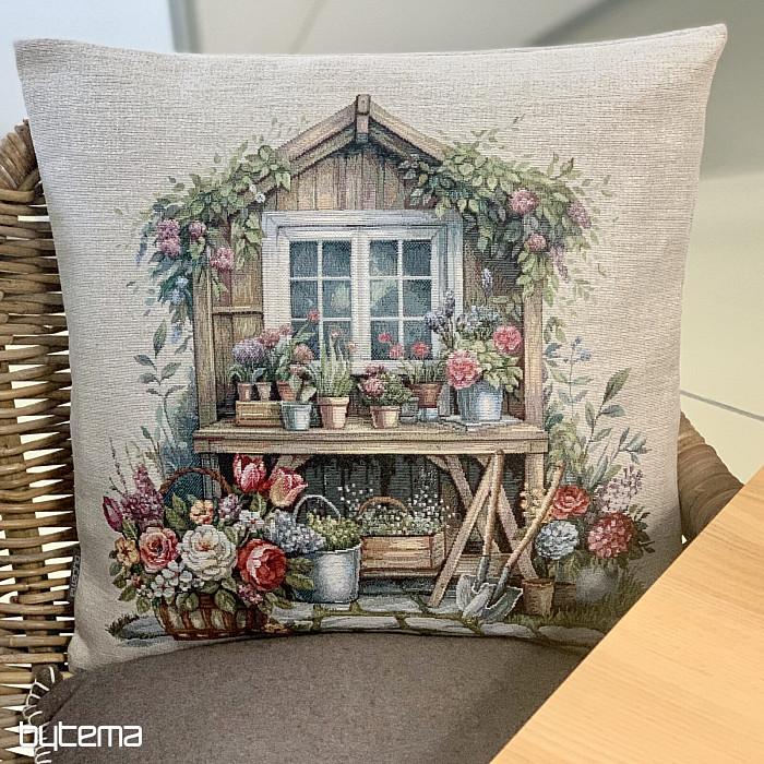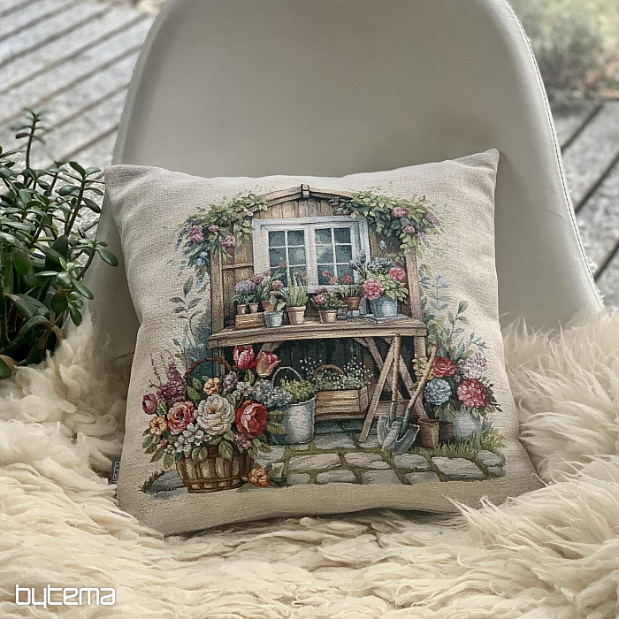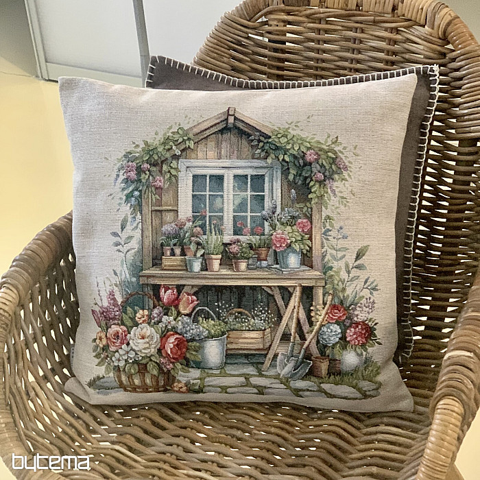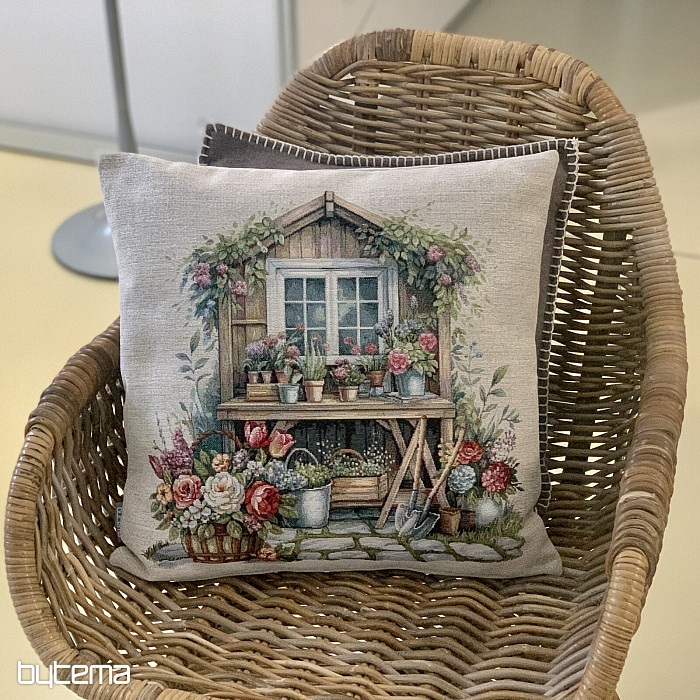 Funda de almohada tapizada con una casita de jardín llena de flores. El estampado de la funda transmite comodidad y calidez primaverales.