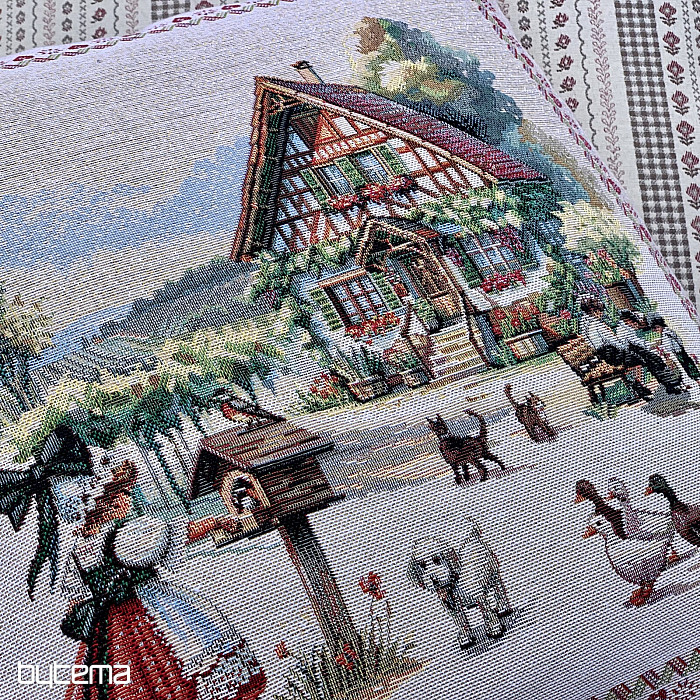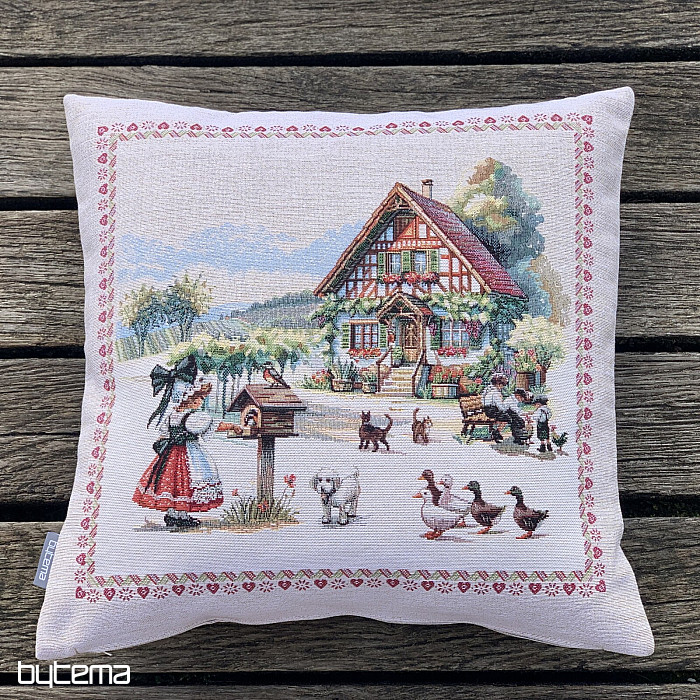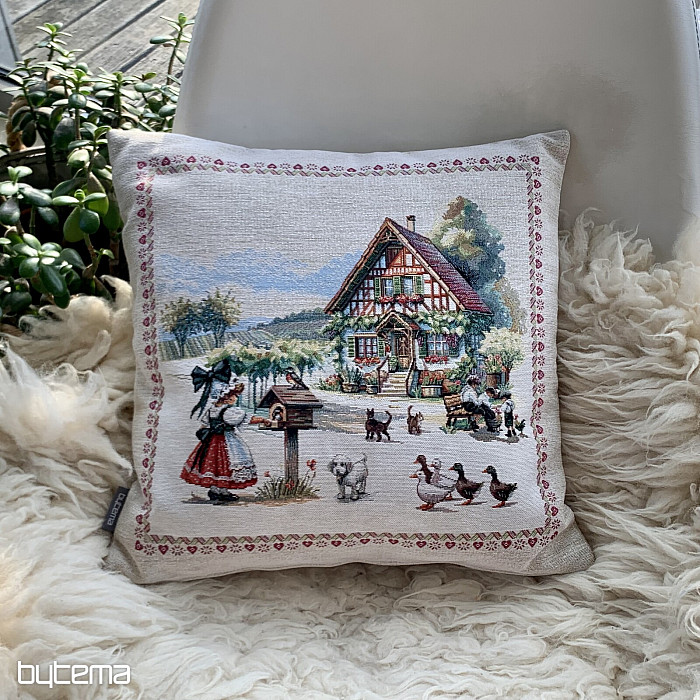 Funda de almohada tapizada con diseño de una casa de campo y un jardín lleno de animales. Una decoración hermosa y poética para quienes aman este paisaje.