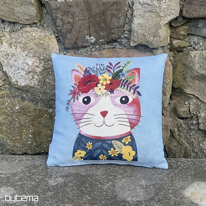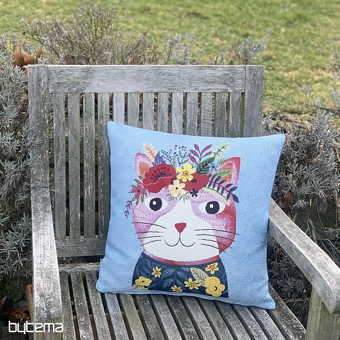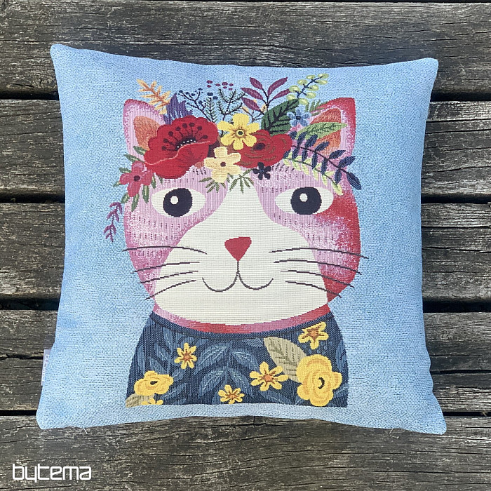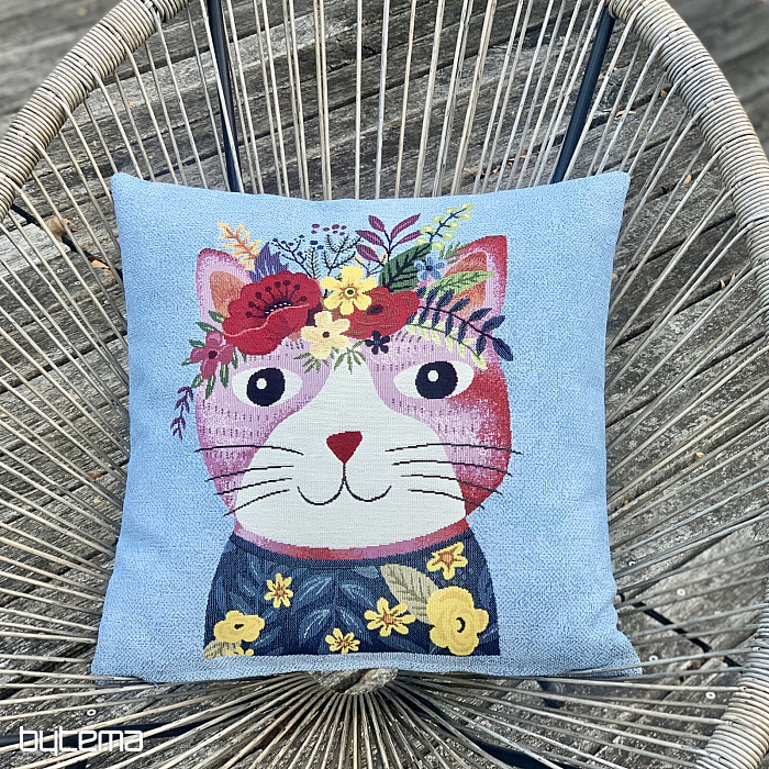 Funda de tapiz con motivo de gato colorido sobre fondo azul.