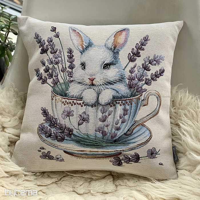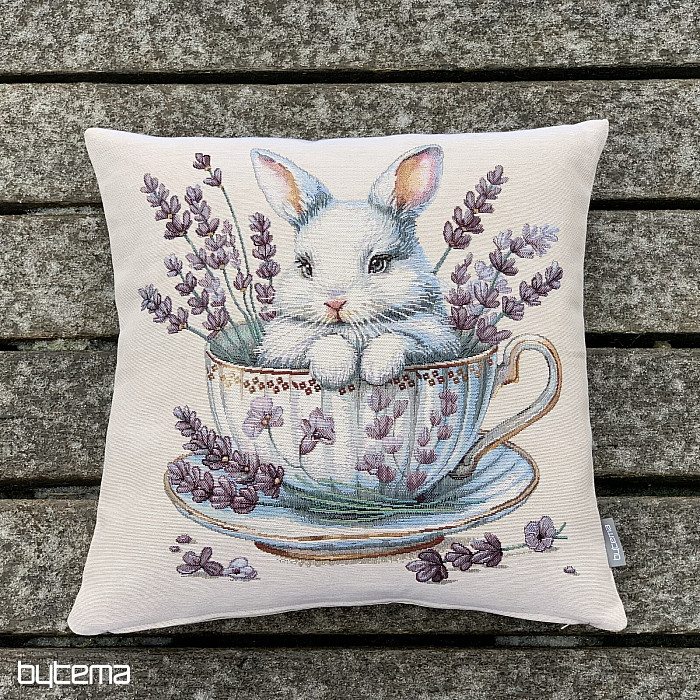 Funda de almohada tapizada con un adorable conejito en un servicio de porcelana con fragante lavanda alrededor. Una decoración hermosa y delicada, no solo para Pascua.