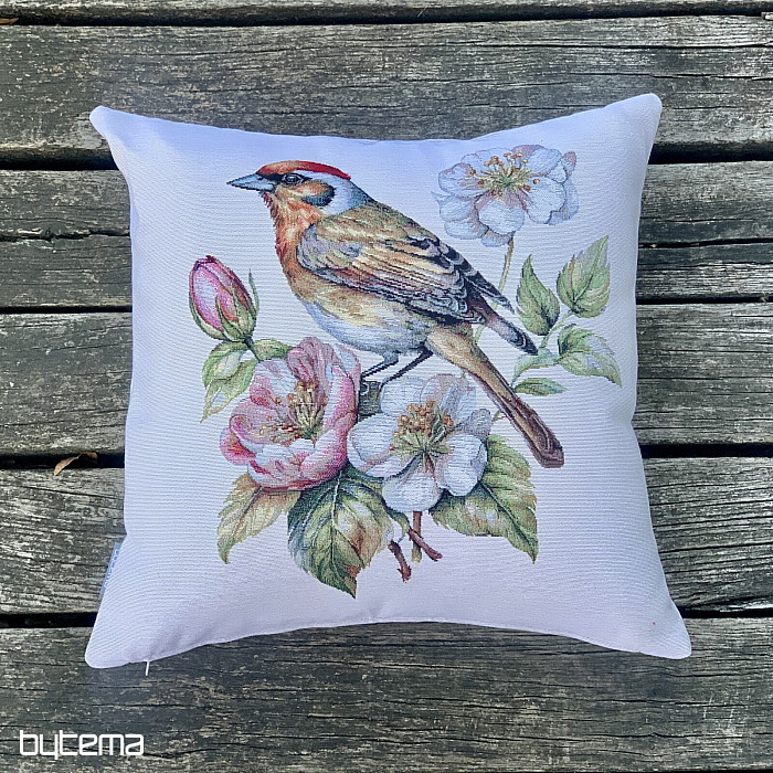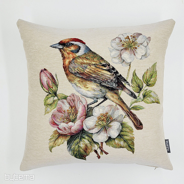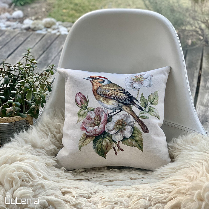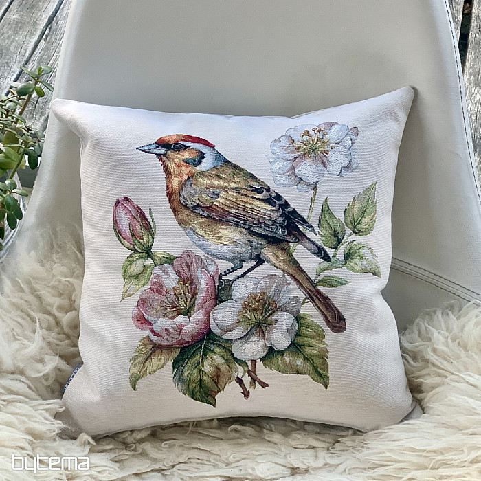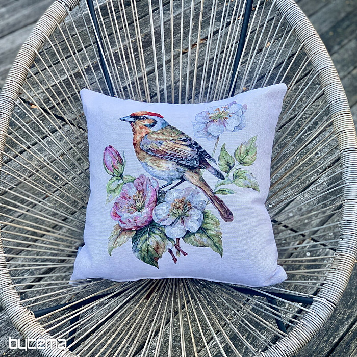 Una funda de almohada tapizada con un jilguero en un manzano en flor será una hermosa decoración para dar la bienvenida a la primavera.