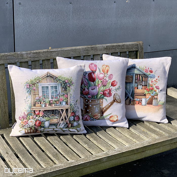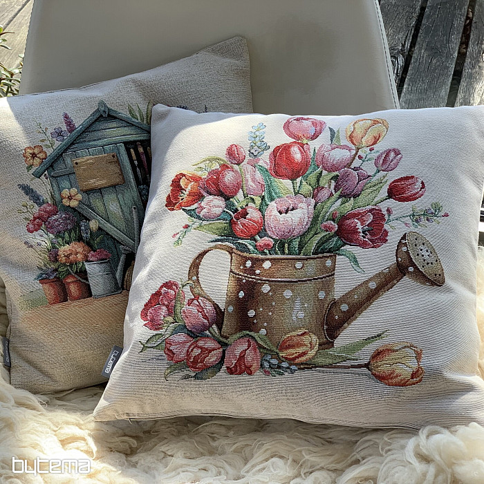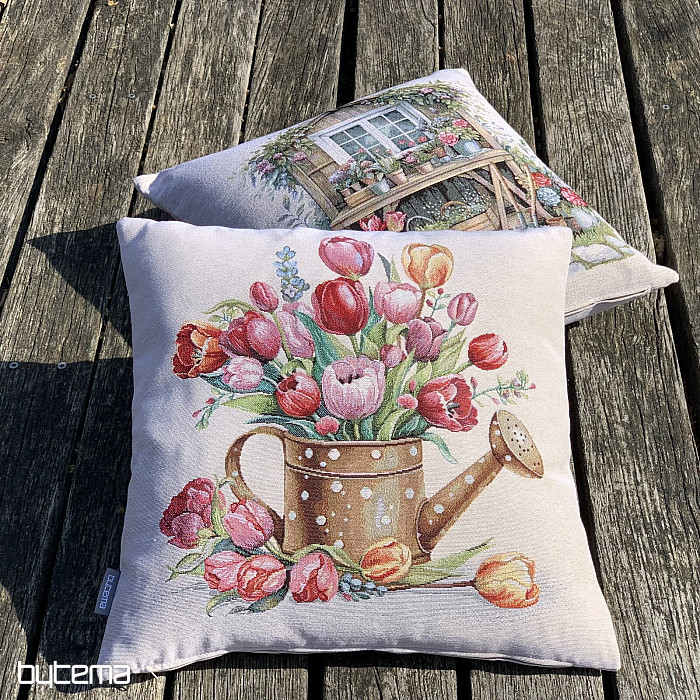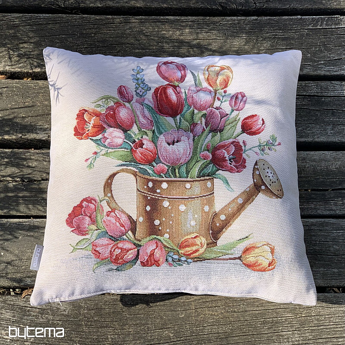 Funda de almohada tapizada con un ramo primaveral de tulipanes de colores en una tetera. Una hermosa decoración primaveral para tu hogar.