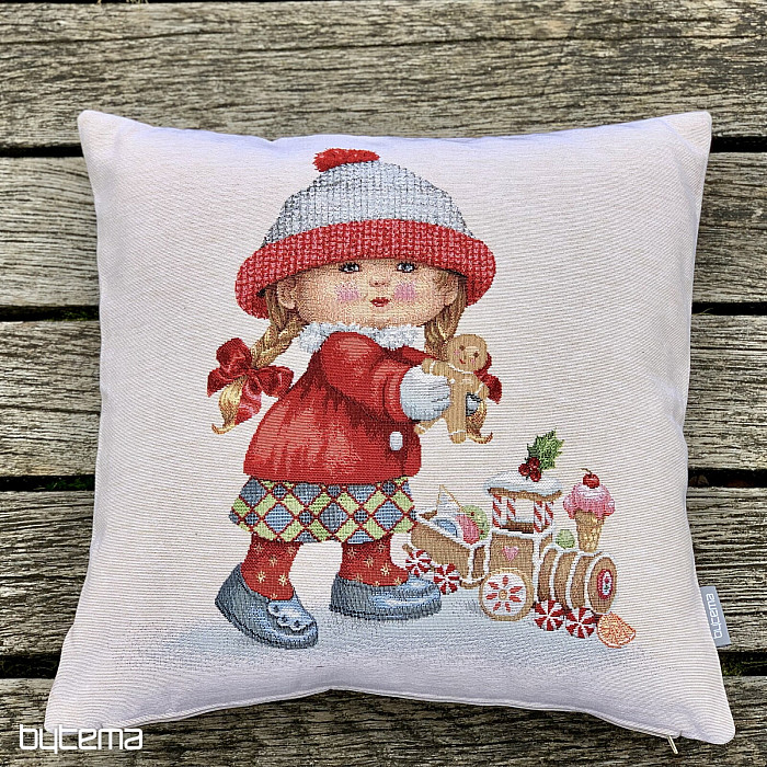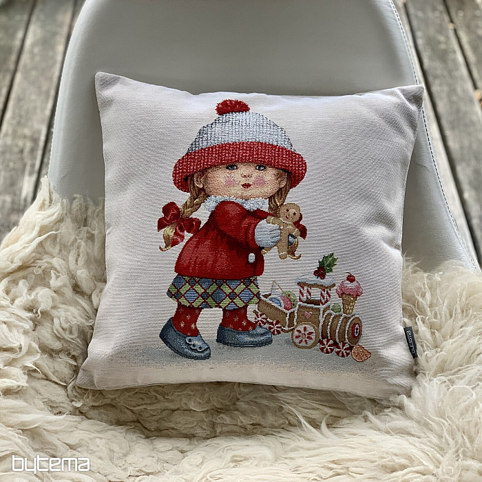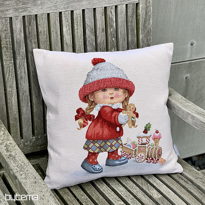 El cojín decorativo tipo tapiz con motivo invernal de una NIÑA con un juguete es tan mágico.