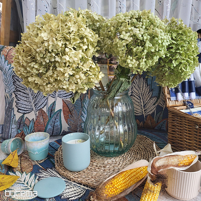 El jarrón de cristal transparente ALBANIA con un ramo de temporada será una decoración única en su mesa de comedor o en la pérgola.