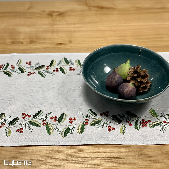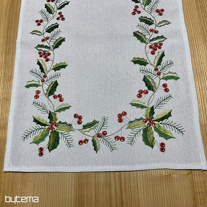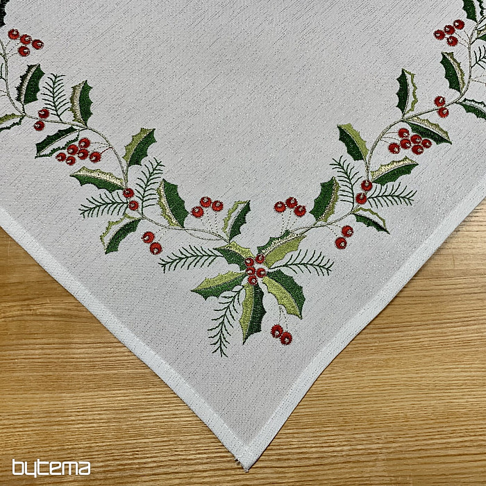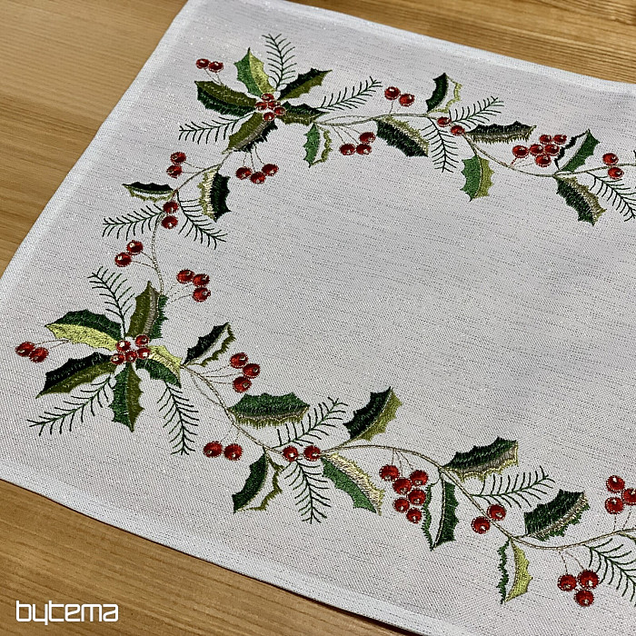 Un mantel bordado con acebo iluminará y dará un toque acogedor a su apartamento durante la temporada navideña.