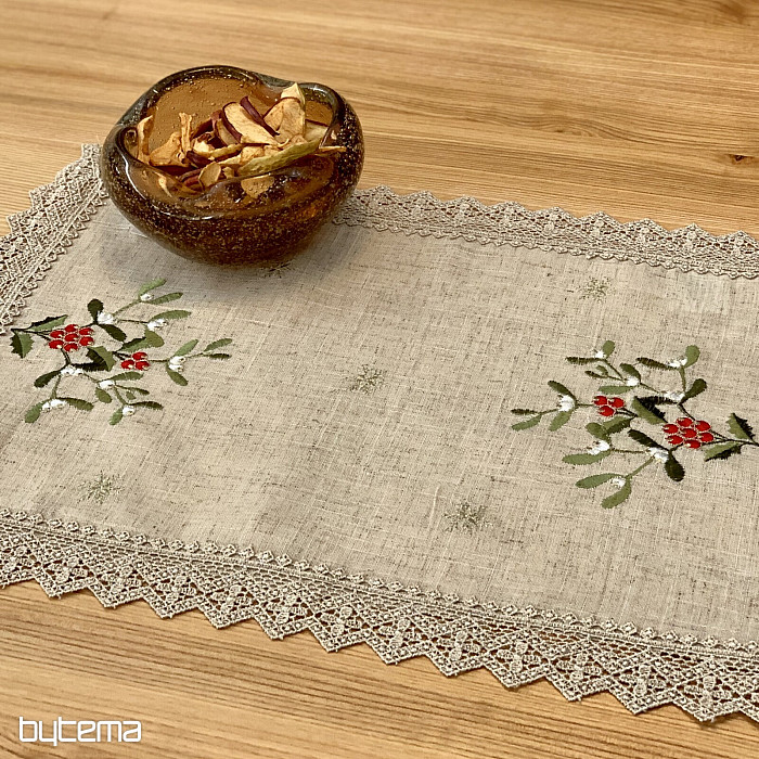 Delicada decoración bordada de muérdago. El mantel individual tiene un borde de encaje que le da el encanto navideño.