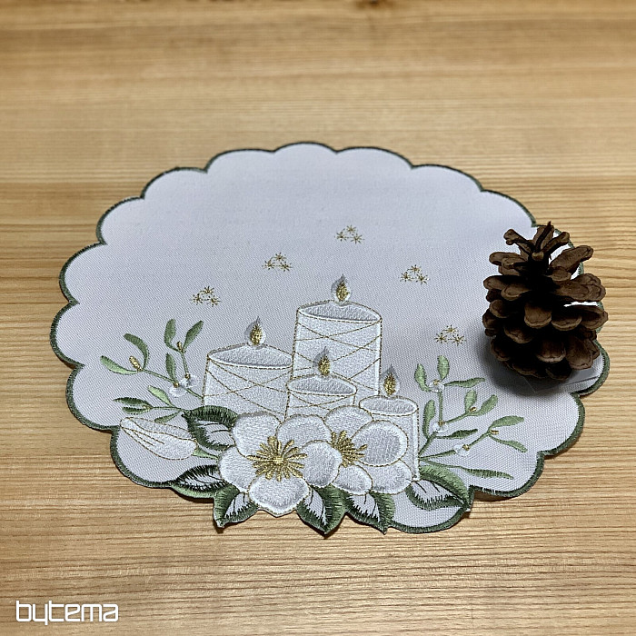 Un mantel navideño bordado con buen gusto y delicadeza con velas de Adviento en color blanco será un complemento encantador para su hogar.