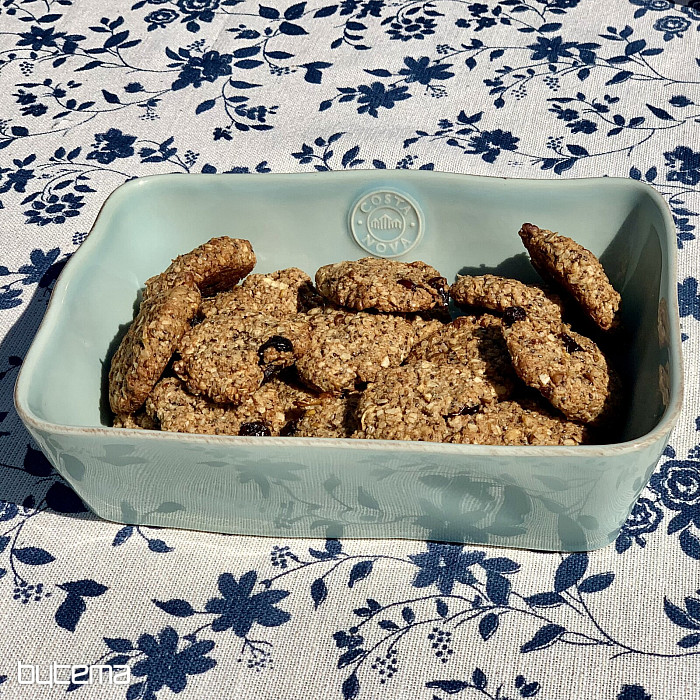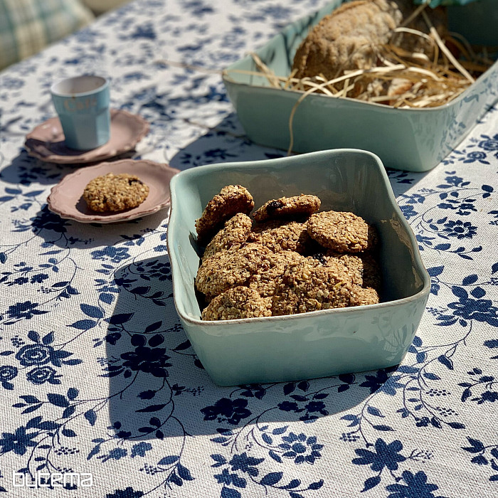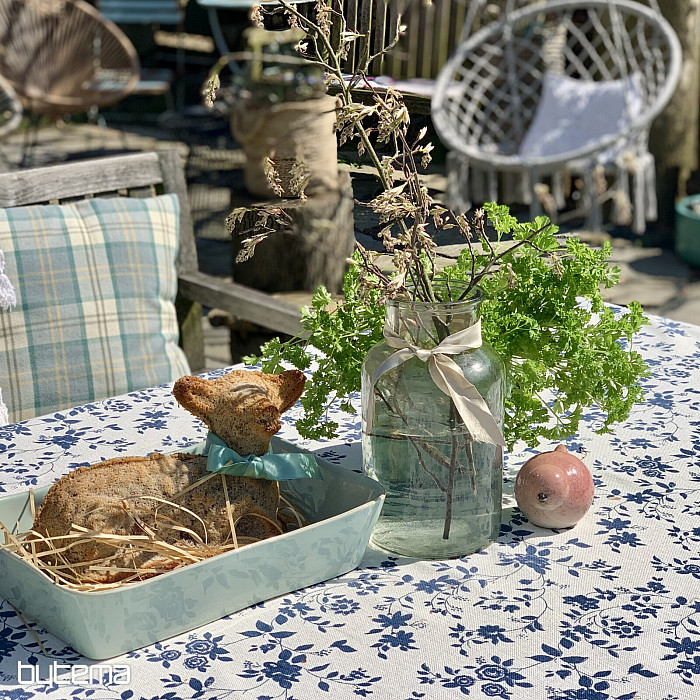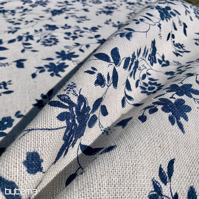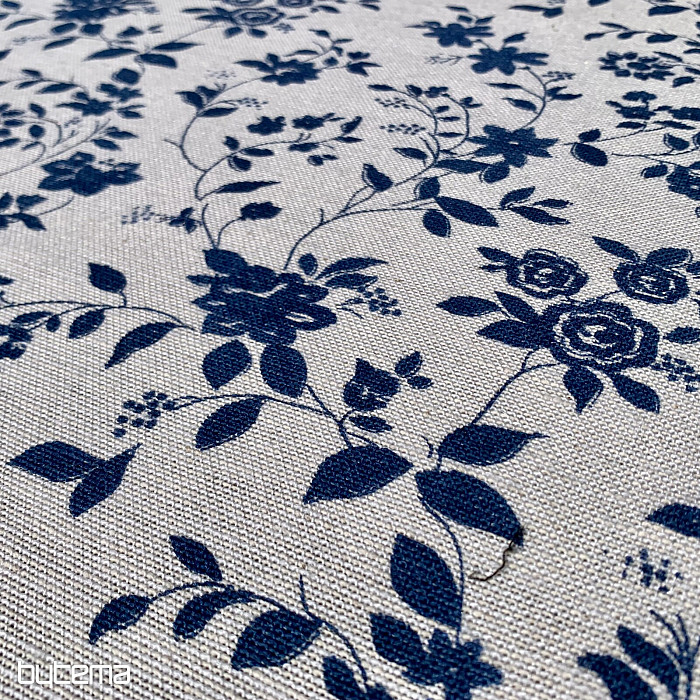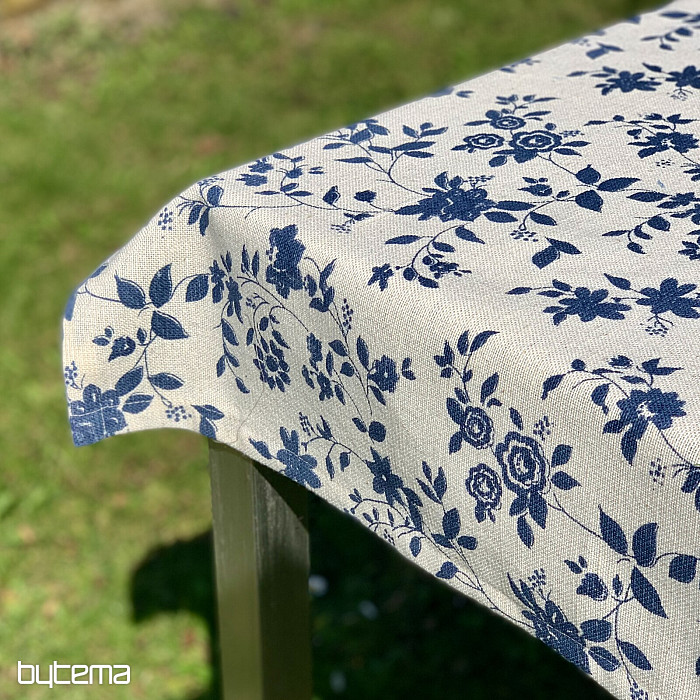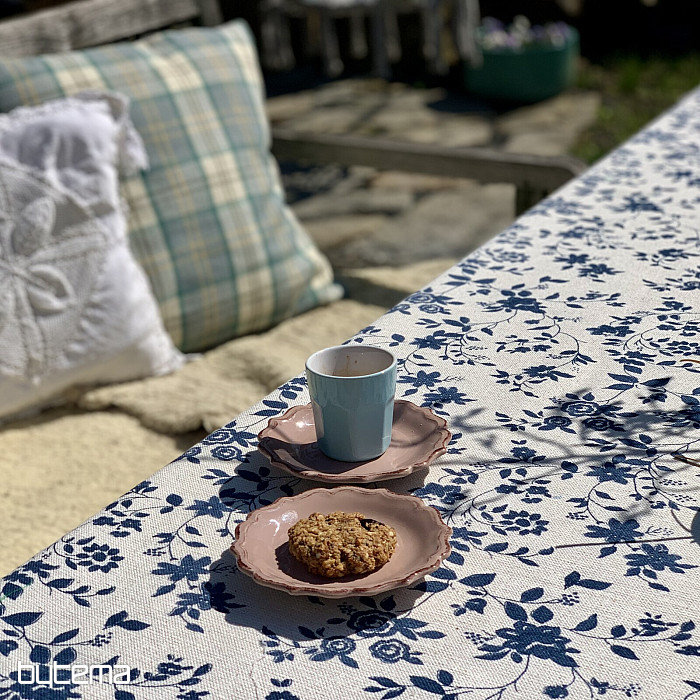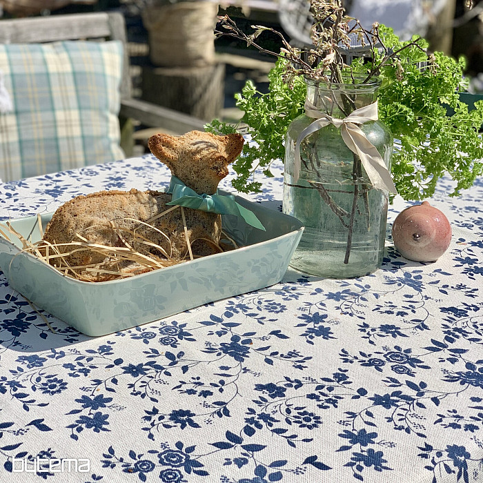 Un precioso estampado de flores azul oscuro sobre un fondo color crema y un material único con una mezcla de lino: el lujoso mantel BLUE ROMANCE.