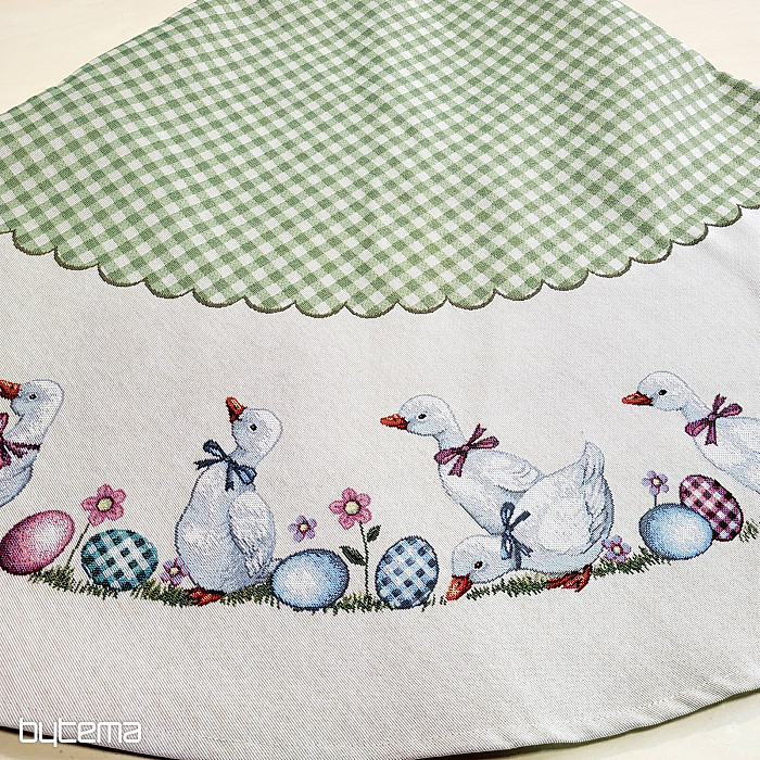 Mantel redondo de Pascua con cuadros verdes y gansos. Una hermosa decoración para tu mesa redonda.
