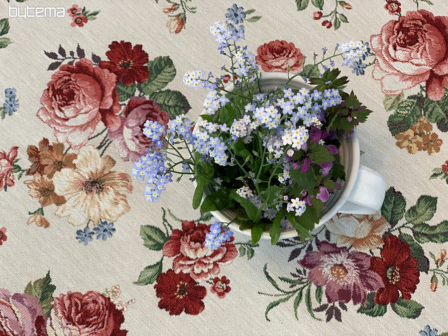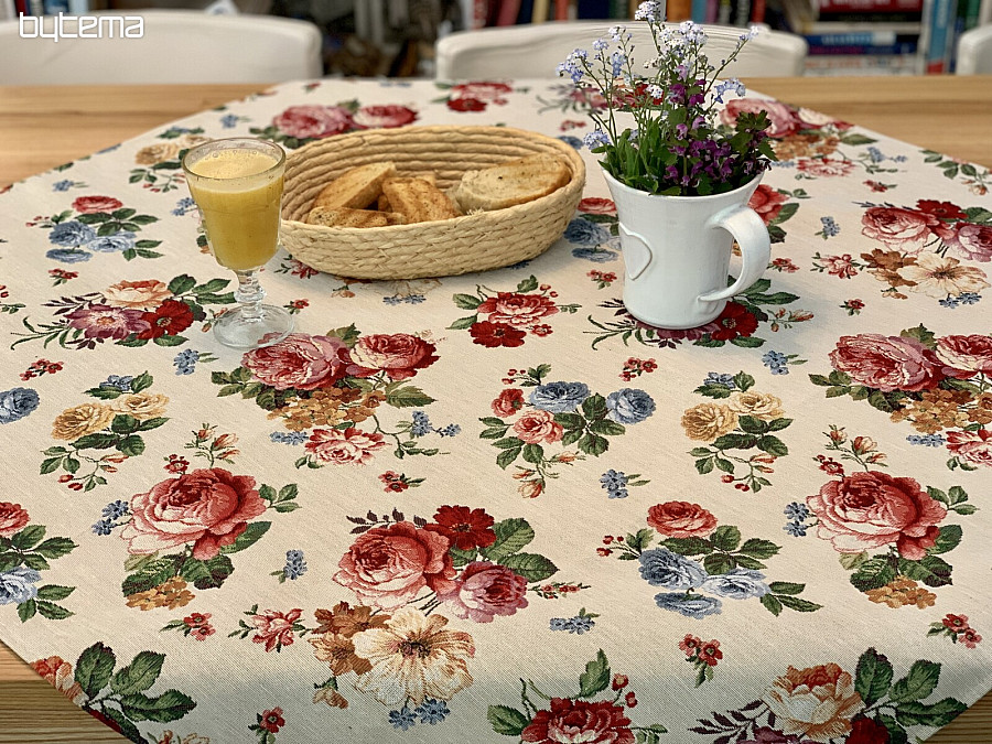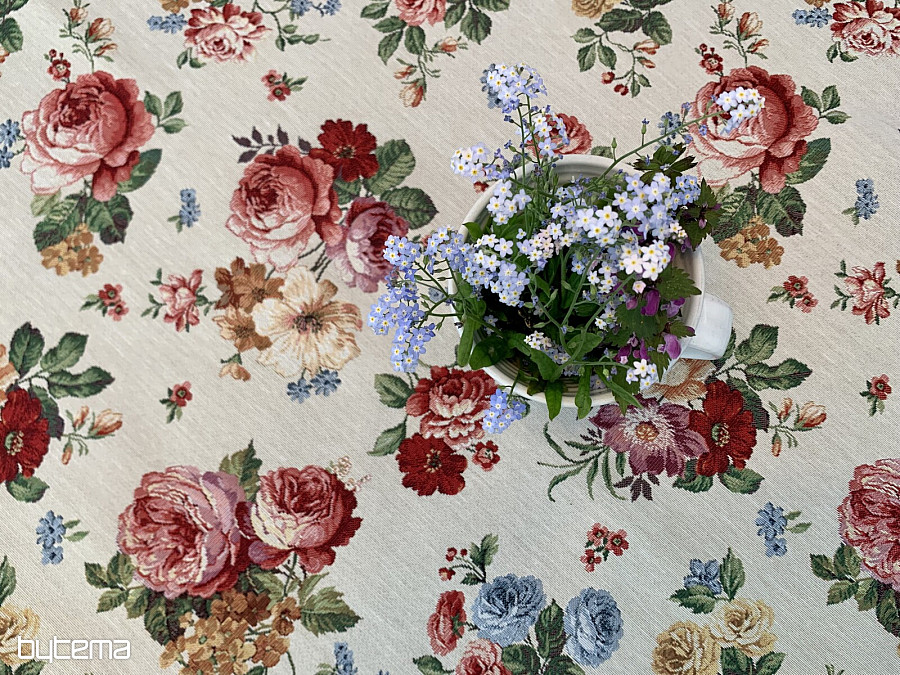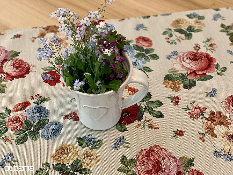 Un mantel tapiz con un romántico ramo de rosas sobre un fondo claro encantará a los amantes del estilo castillo. Ofrecemos cojines decorativos a juego y también confección a medida. Prueba nuestra calculadora.