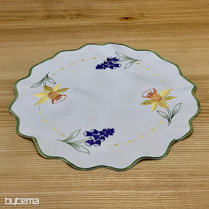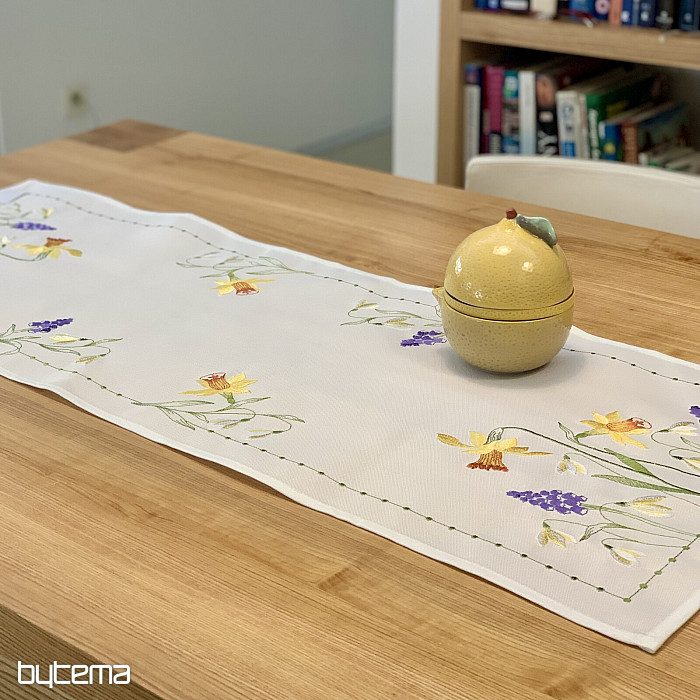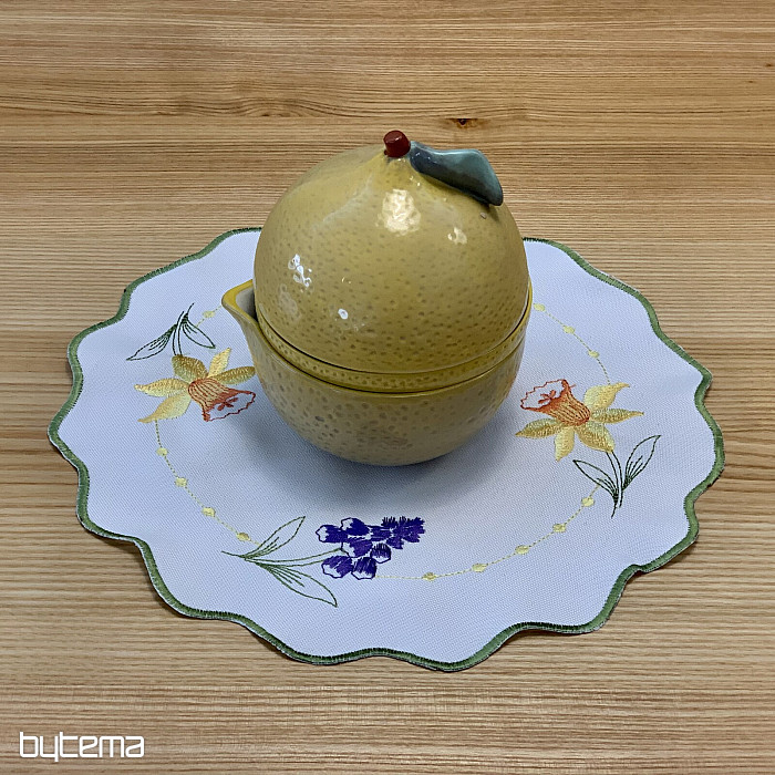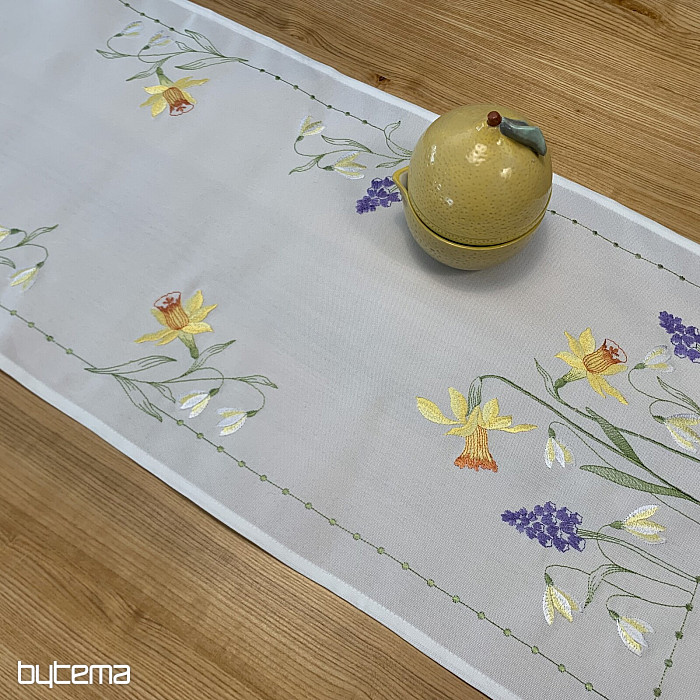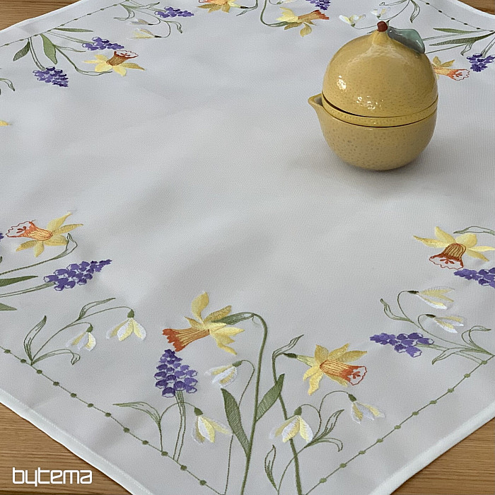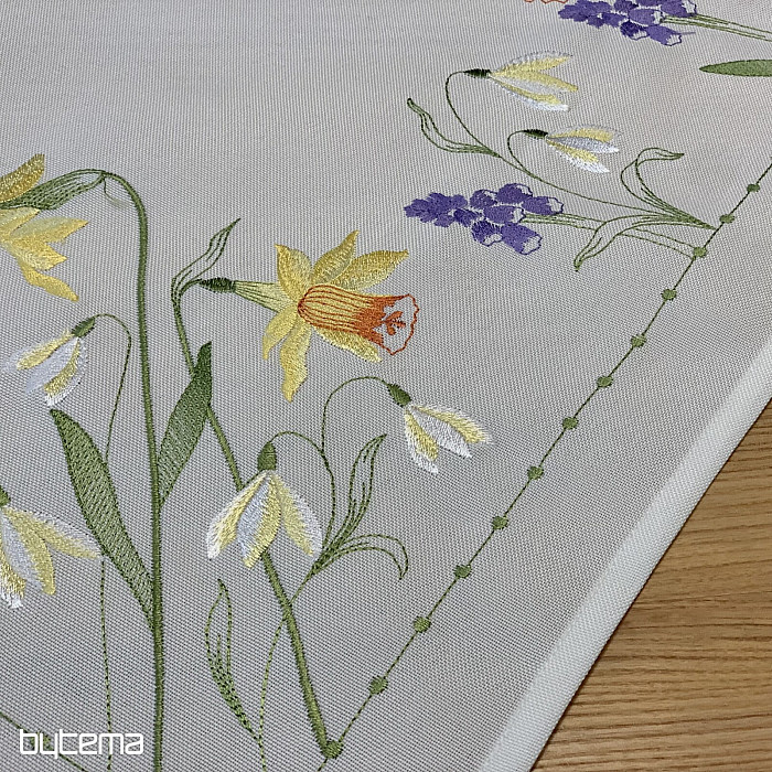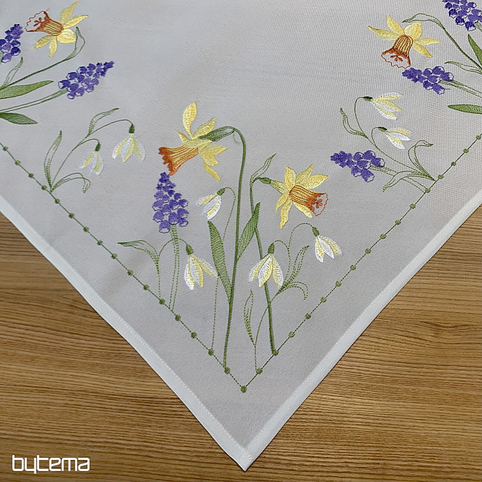 Mantel y pañuelo bordados con motivo de narcisos, campanillas de invierno y moras, un motivo primaveral que nunca pasa de moda.