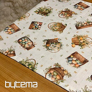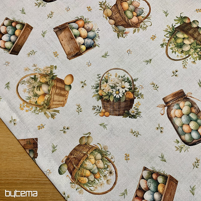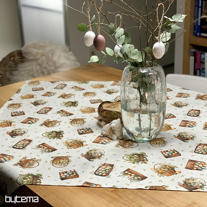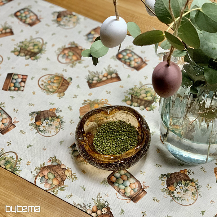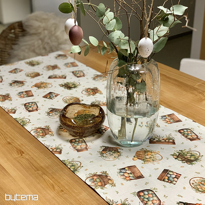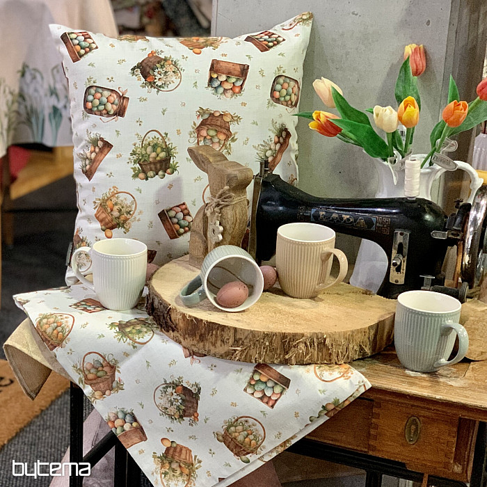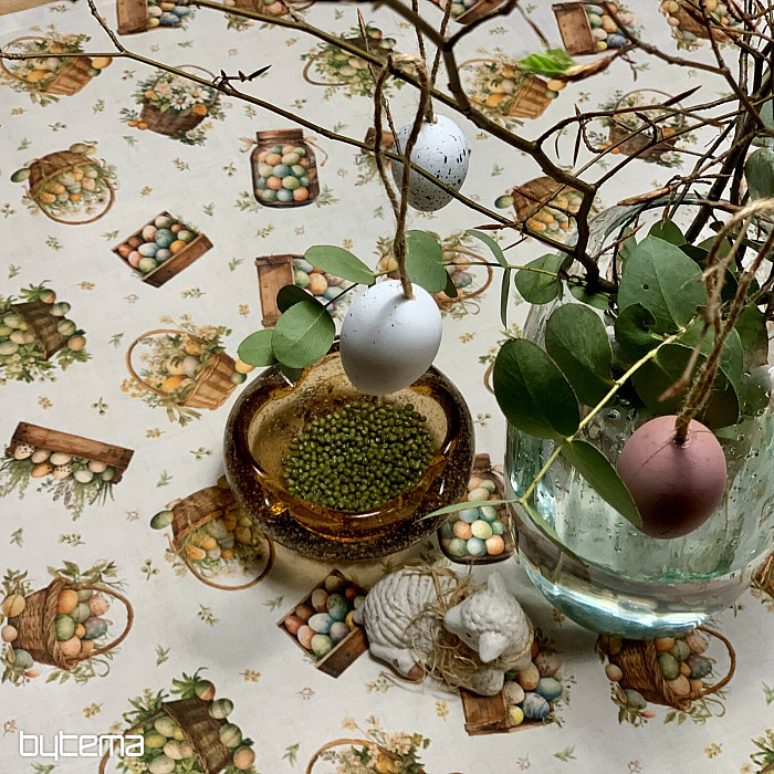 Un mantel o bufanda de Pascua lleno de huevos de Pascua en varios recipientes será una bonita decoración en tu hogar.