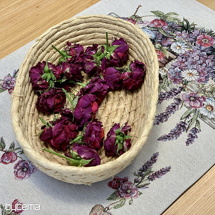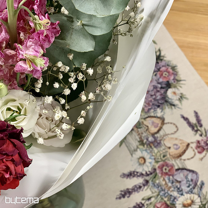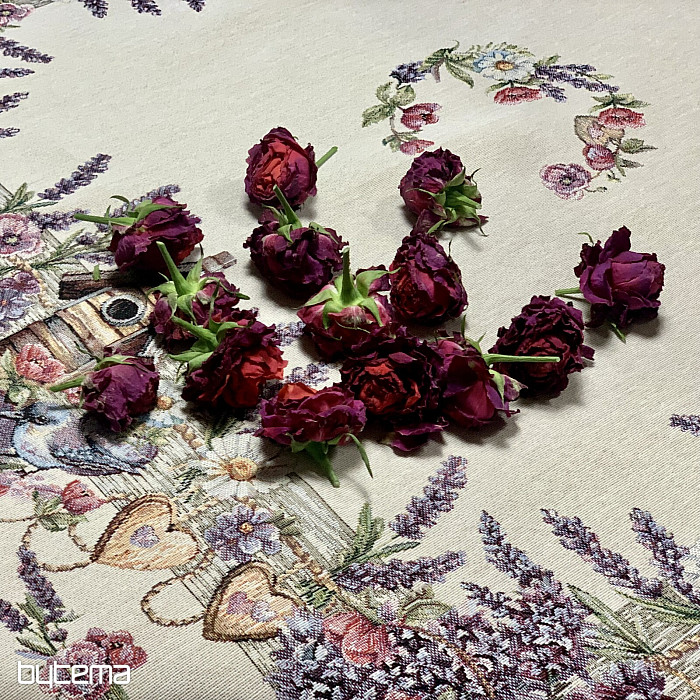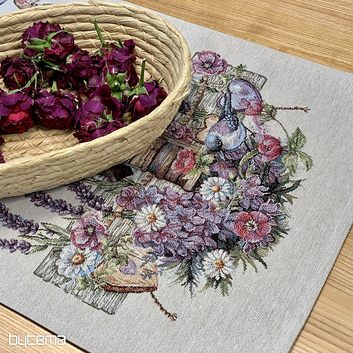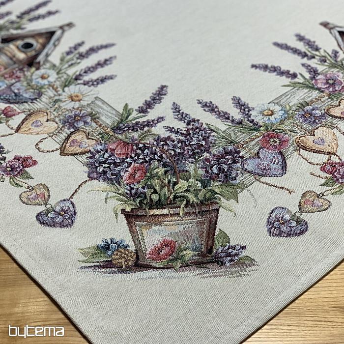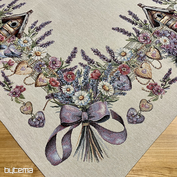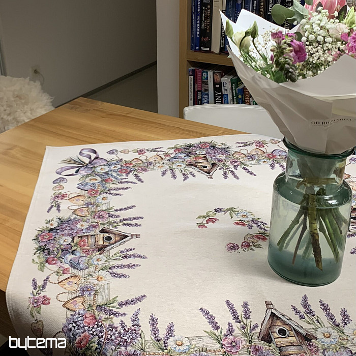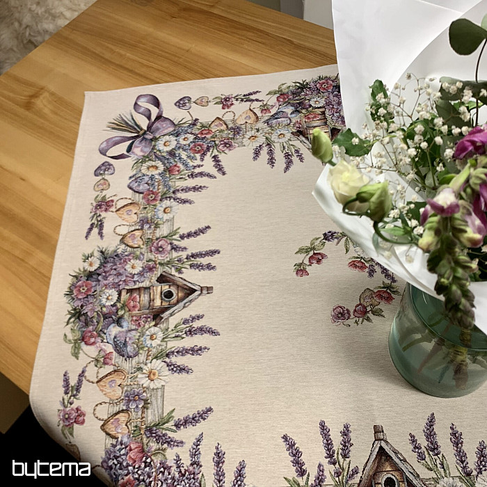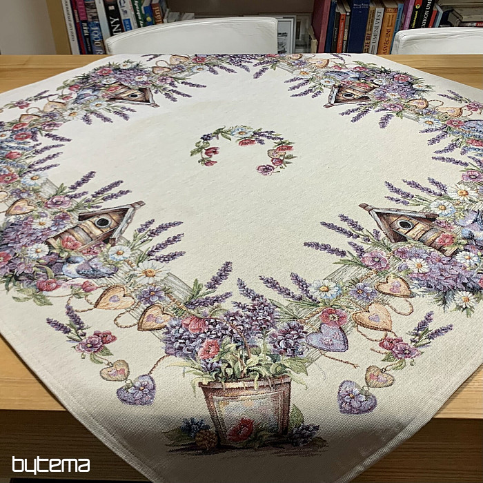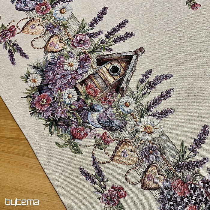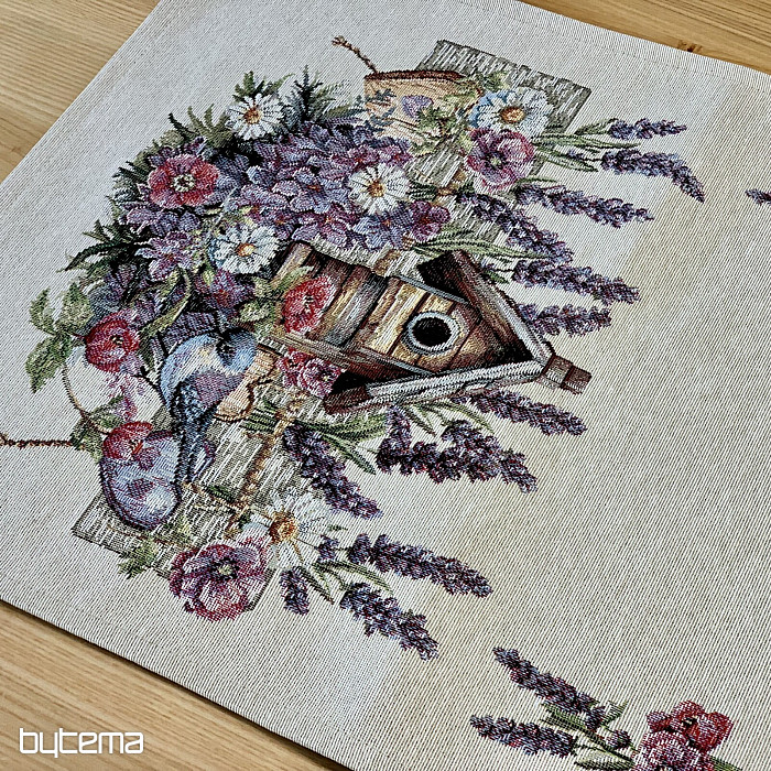 Mantel o pañuelo tapiz con una casita para pájaros, un pájaro y delicada lavanda. Un diseño hermoso y delicado que te encantará todo el año.