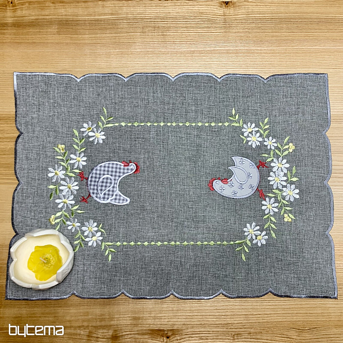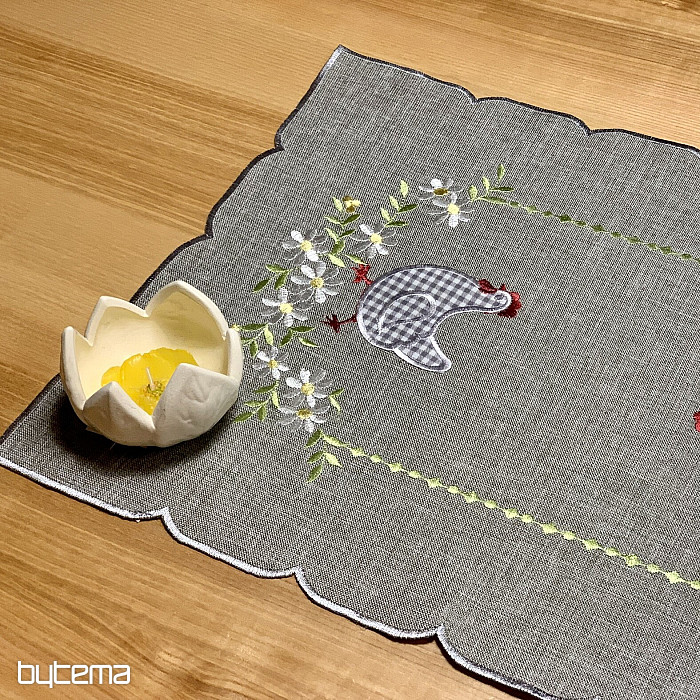 Los manteles bordados y las bufandas con gallinas en flores primaverales son perfectos para el ambiente de Pascua.