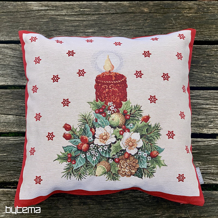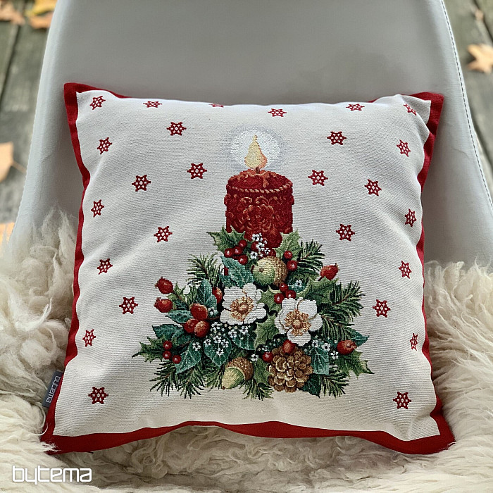 Una funda de almohada con tapiz navideño y una hermosa vela encendida aportará la calidez navideña a tu hogar.