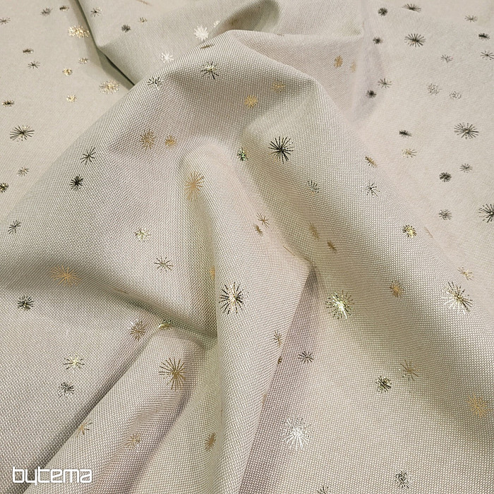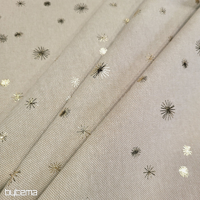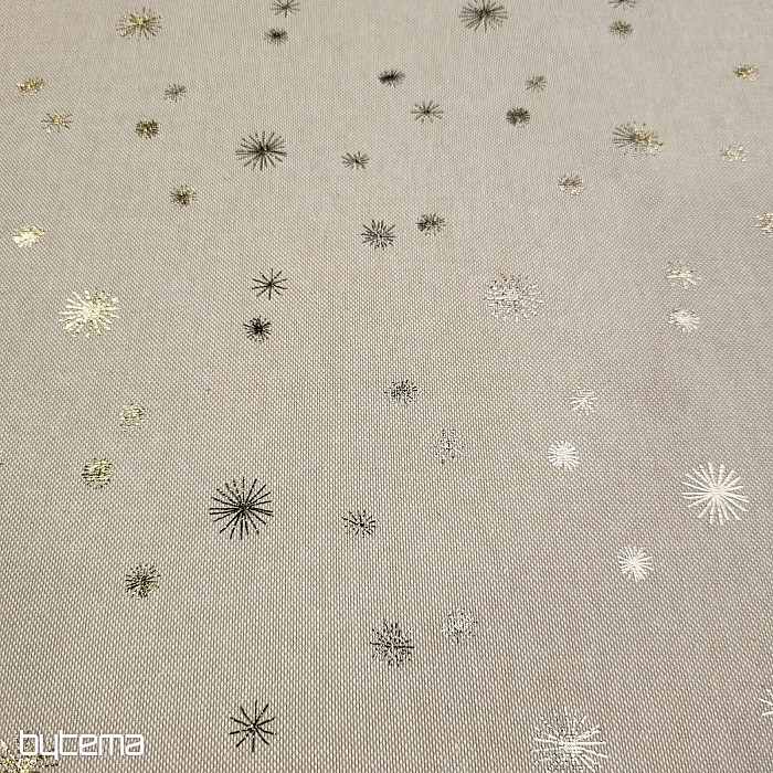 Tela CANVAS de algodón más gruesa con estrellas doradas navideñas o copos de nieve sobre un fondo texturizado, es perfecta para manteles, manteles individuales o fundas de almohadas.
