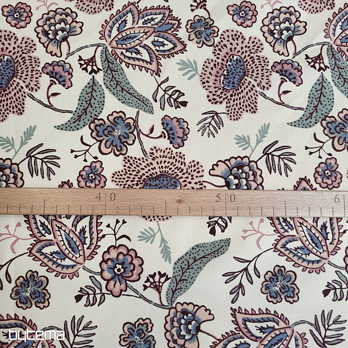 La tela con un mayor contenido de algodón, 220 g, con un diseño de flores boho florecientes se verá hermosa en una cortina decorativa o un mantel en su hogar.