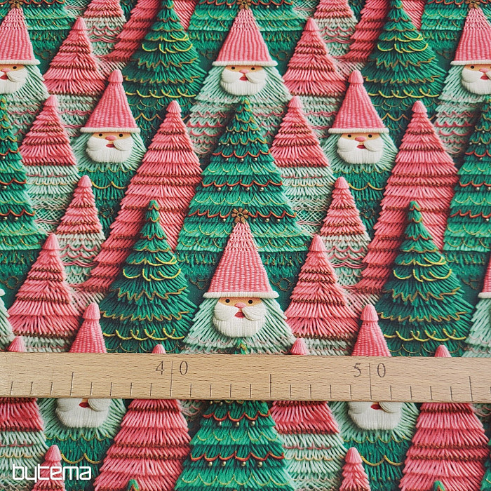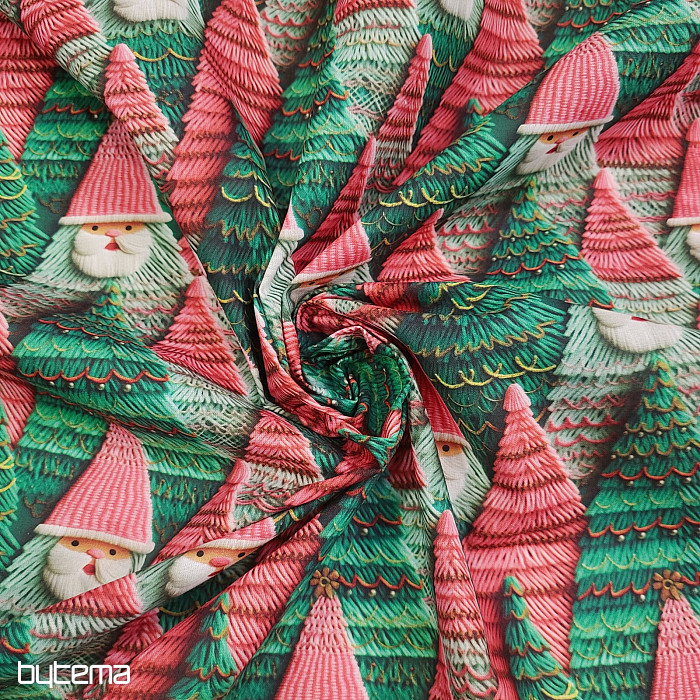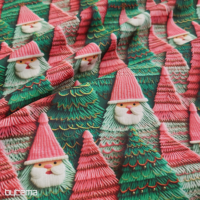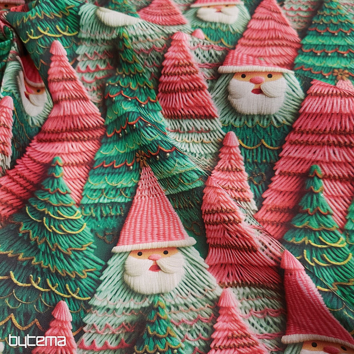Tela decorativa navideña con la simpática cara del elfo Arthur, perdido en el bosque. Ideal para confeccionar manteles, cortinas y fundas de almohada.