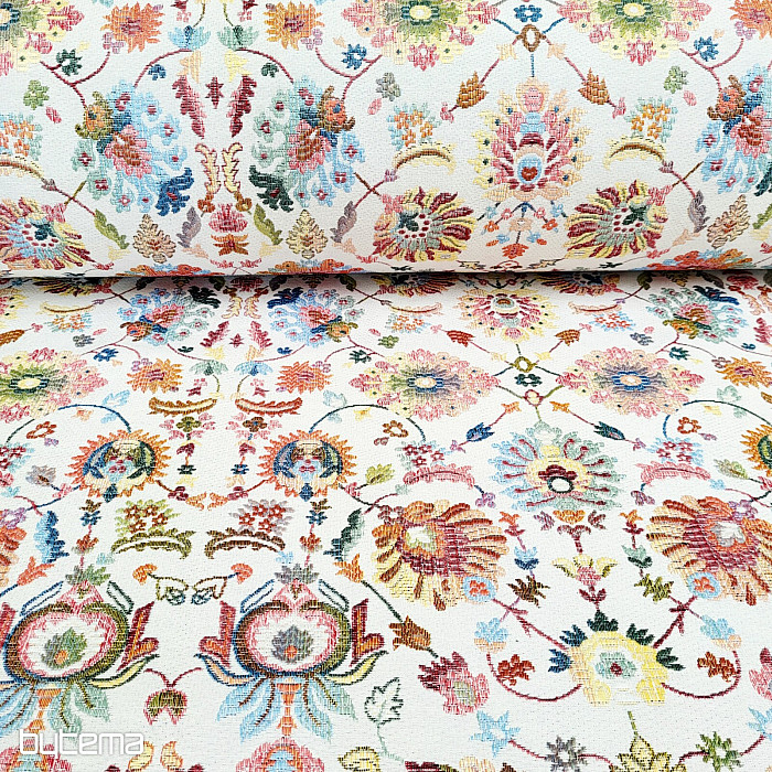 Nuestra nueva incorporación a la tienda es una tela de tapiz con distintivas flores indias que crean interesantes ornamentos.