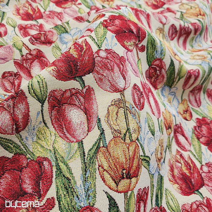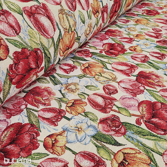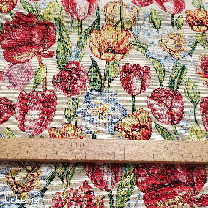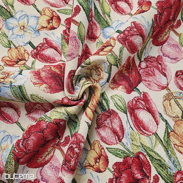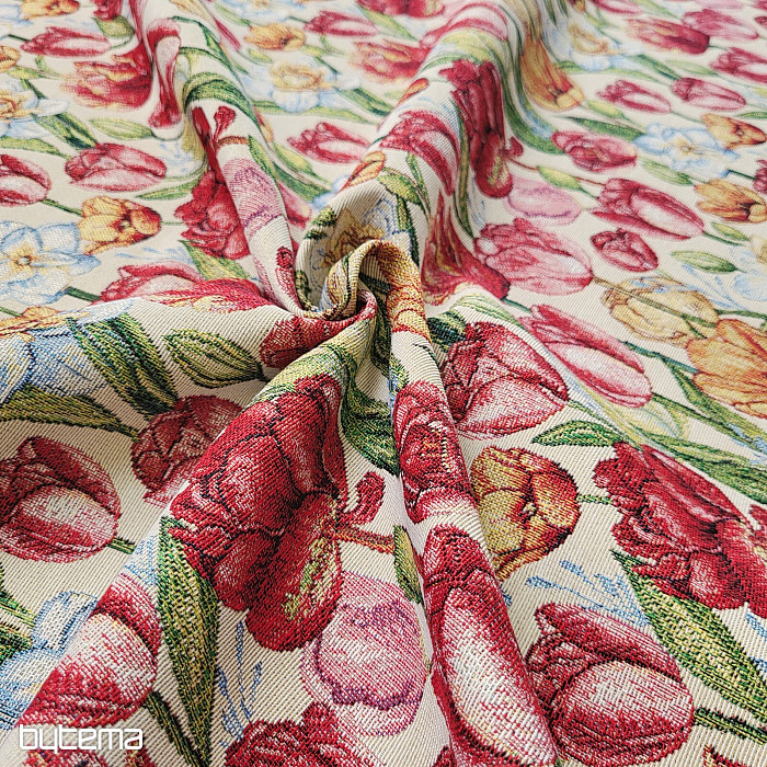 Preciosa tela de tapiz con flores primaverales de tulipanes y narcisos. Un maravilloso y colorido baño de flores y primavera para tu mesa.