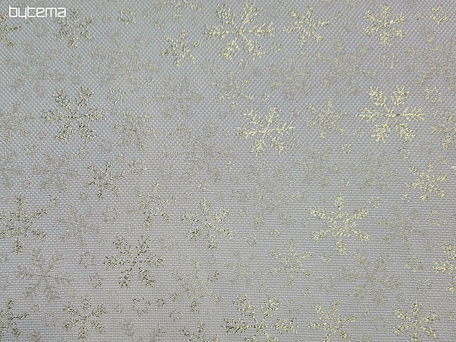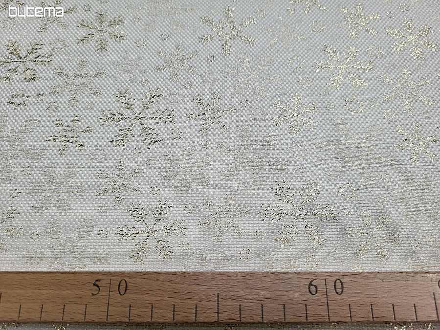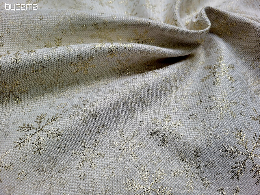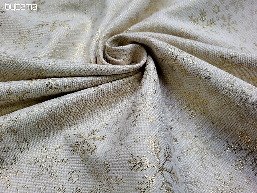 La tela decorativa navideña de bonitos copos dorados grandes y pequeños sobre fondo crema será una decoración mágica en tu hogar.