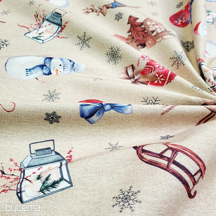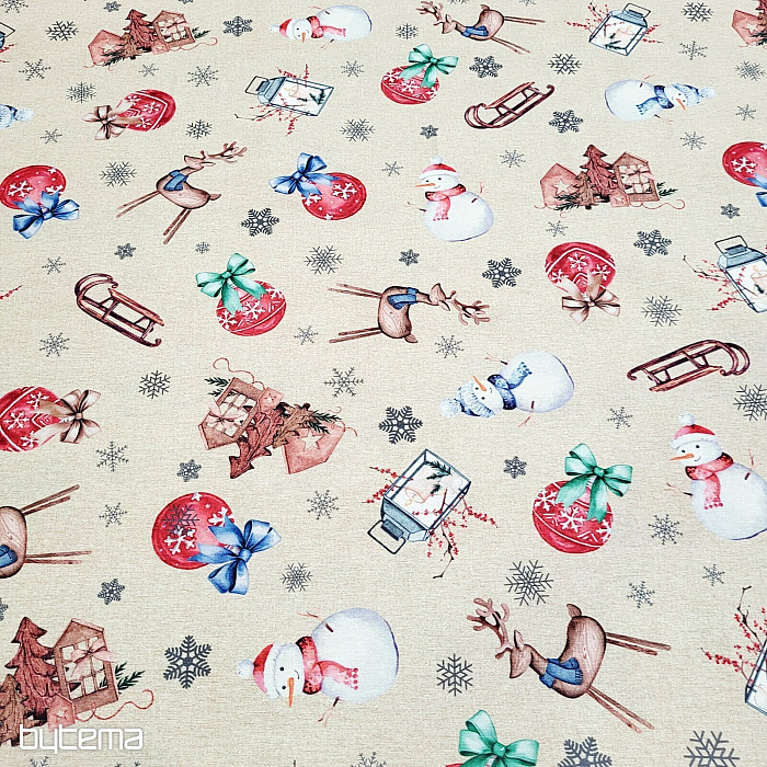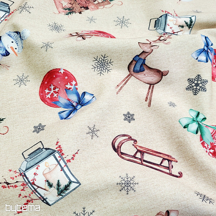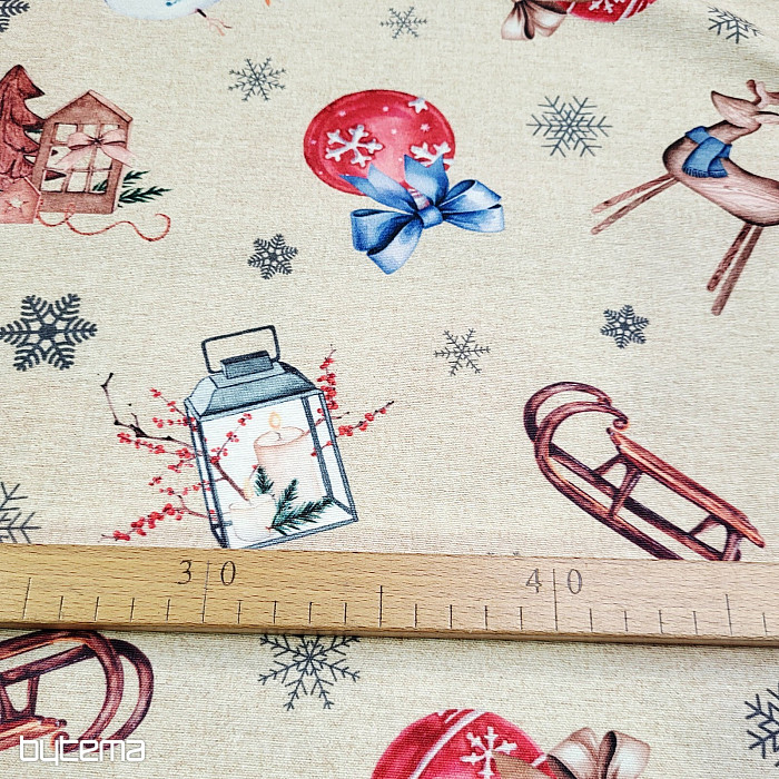 Tela decorativa navideña repleta de preciosos accesorios, imprescindibles para Navidad.