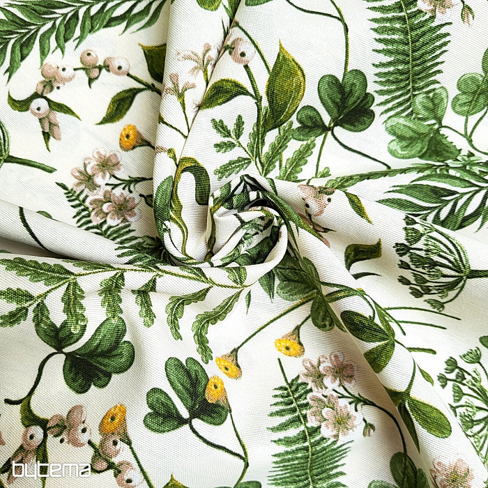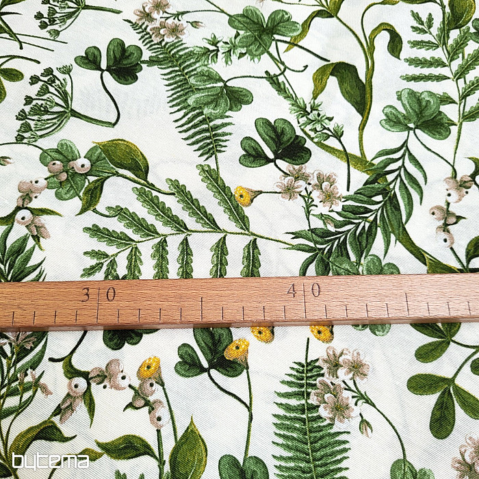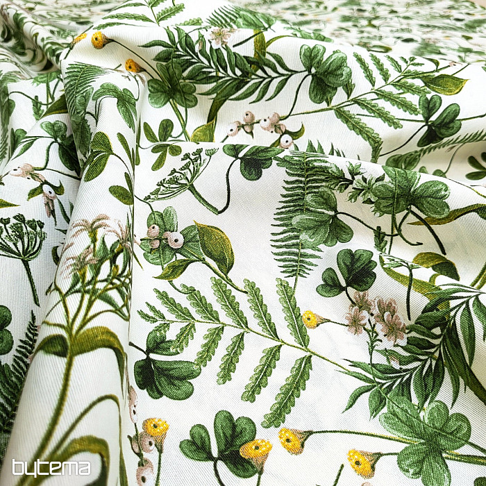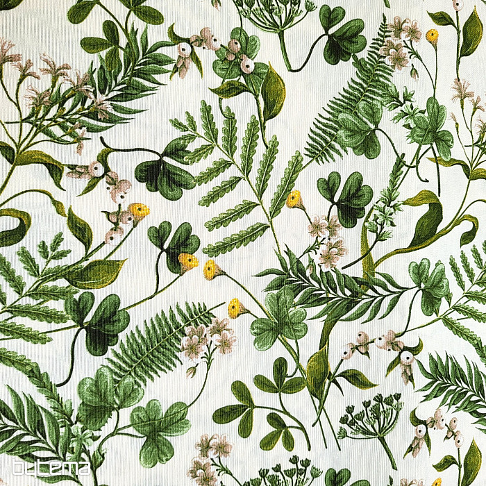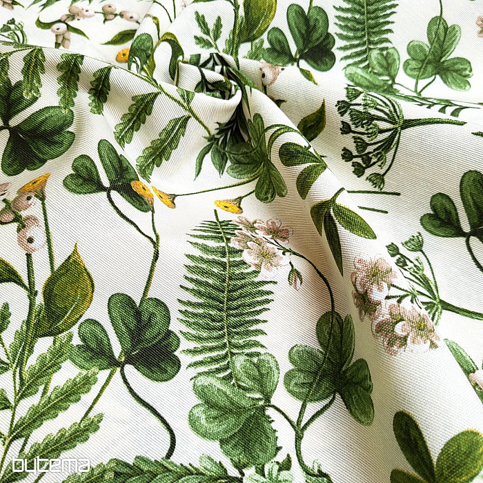 Tela decorativa con trébol silvestre y hierbas en color verde intenso.